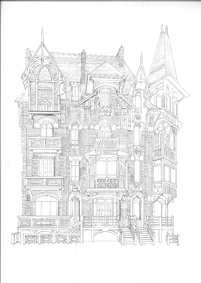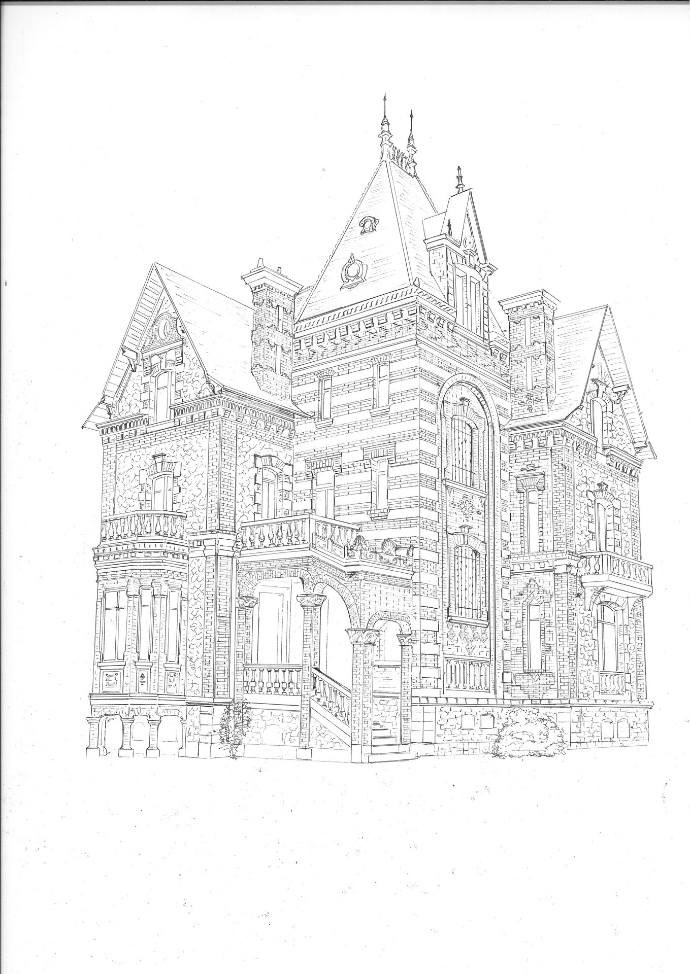 Loin des techniques du dessin numérique, je retranscris d'abord au crayon sur un papier beaux-arts tous les traits qui composent l'élément architectural, en respectant les proportions avec précision, les perpectives et lignes de fuite.